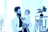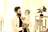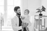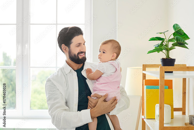 Indoor shot of happy father carrying small daughter on hands, smiling and looking gladfully at his child, being glad of fatherhood, posing in cozy room. Dad and his little toddler girl