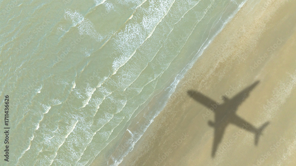 Aerial view of shadow passenger plane silhouette and sandy beach blue sea with waves at sea beach summer vacation sea travel concept