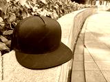 Black trucker cap on stone surface outdoors with background of red leaves and urban walkway