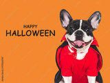 Happy Halloween. Charming puppy and congratulatory inscription. Dog smile. Closeup, indoors. Studio shot. Congratulations for family, relatives, loved ones, friends and colleagues. Pet care concept
