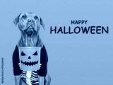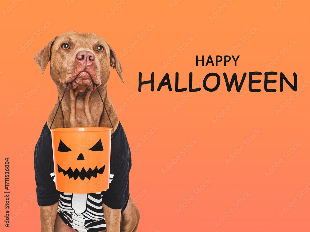 Happy Halloween. Charming dog and congratulatory inscription. Closeup, indoors. Studio shot. Congratulations for family, relatives, loved ones, friends and colleagues. Pet care concept