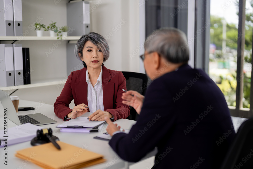 Asian Woman Lawyer Provides Legal Advice to Client During Professional Office Meeting