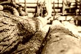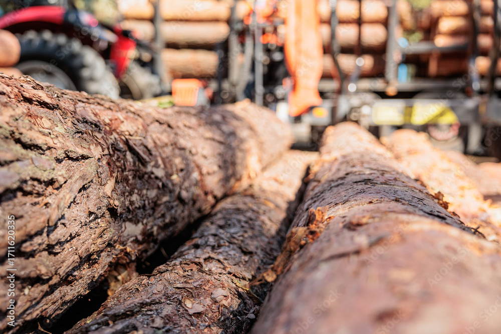 Close up of tree trunks in nature. many cut tree trunks. Front view.