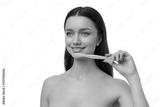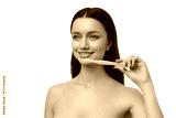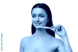 Woman shows teeth care with wooden tool, isolated, PNG
