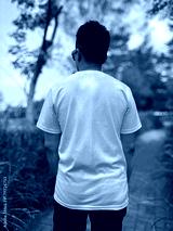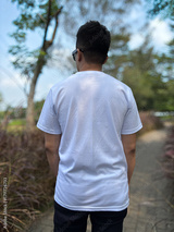 Back view of a man wearing white short sleeve t-shirt and sunglasses posing in a park