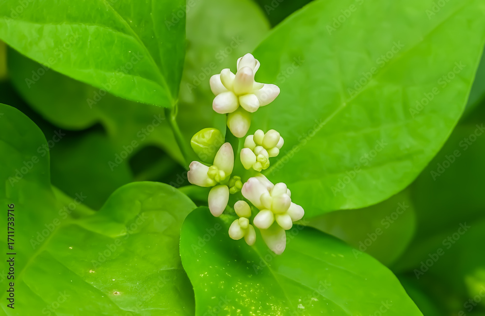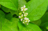 A cluster of small, white flowers with a pinkish hue is surrounded by bright green leaves.