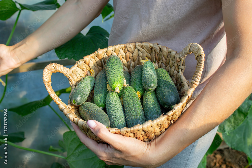 Woman harvesting cucumbers, cucumbers in hands. Selective focus