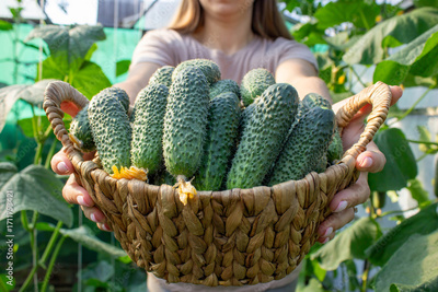 Woman harvesting cucumbers, cucumbers in hands. Selective focus