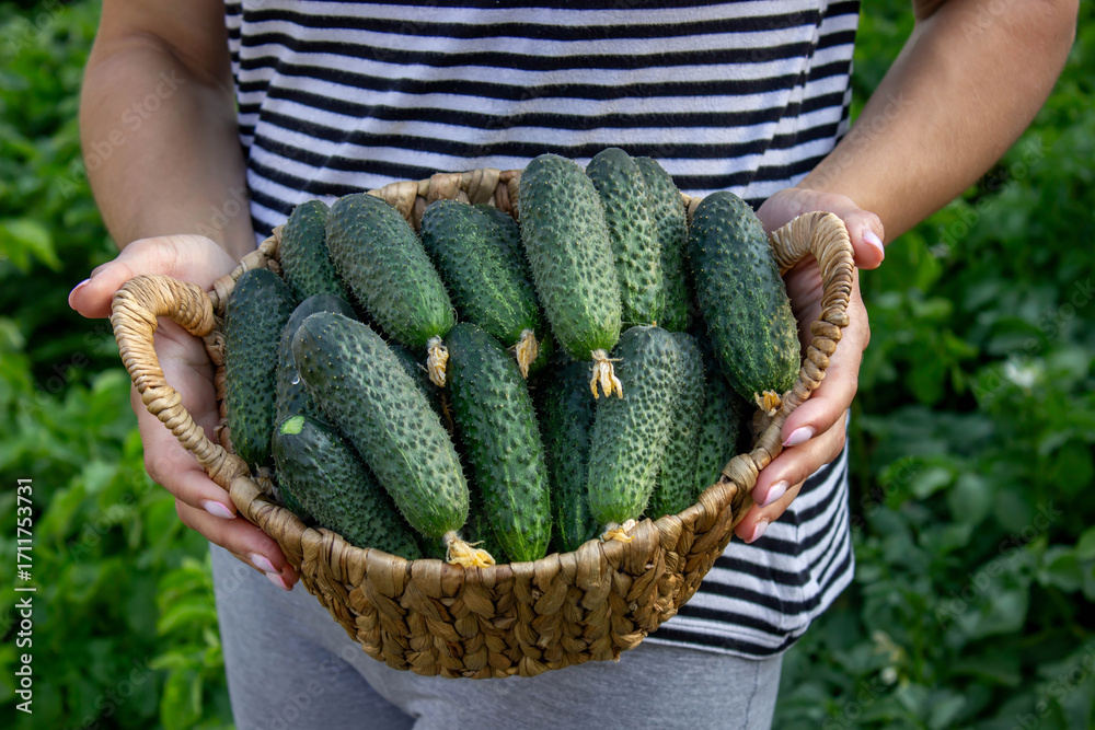 Woman harvesting cucumbers, cucumbers in hands. Selective focus