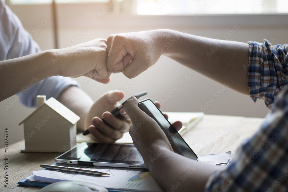Two businessman or engineer holding phone take fist hit and cooperate in business to success about construct home or building