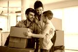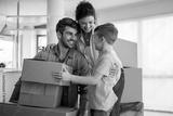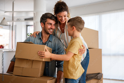 Smiling man and woman enjoy unpacking with child moving to own home. Rent, mortgage concept