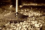 Collection of colorful fall leaves. Raking autumn leaves from the lawn in the autumn park. The concept of volunteering, seasonal gardening. Pile of fall leaves with fan rake on green lawn