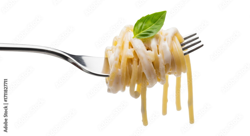 Isolated twirled spaghetti with creamy sauce and basil on a fork, food presentation