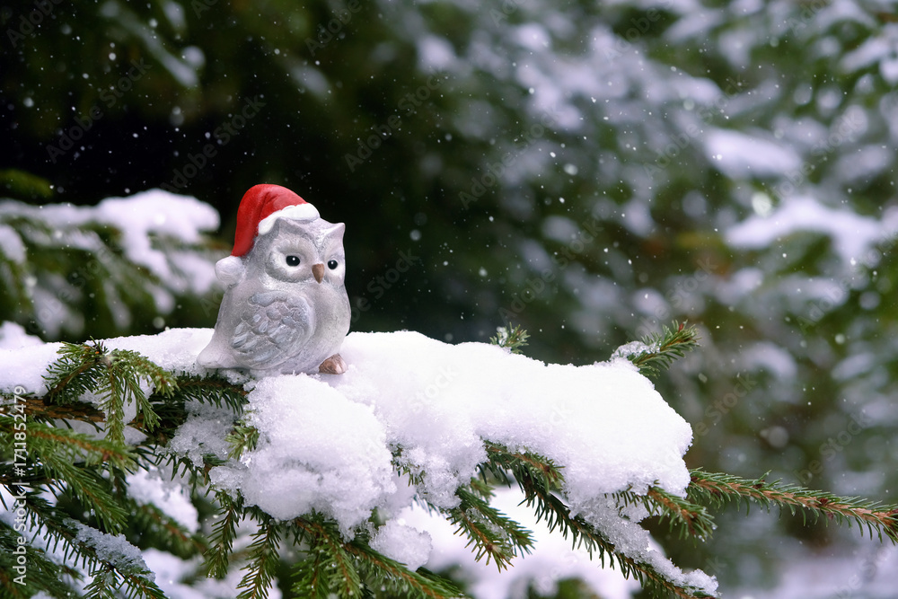 Christmas and New year holidays concept. cute little bird figurine in santa hat on snowy fir tree, nature forest background. festive winter season. magic fairy tale atmosphere. cold frozen weather