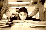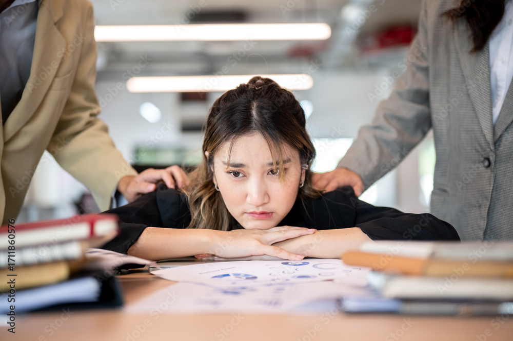 Upset asian businesswoman resting head on arms while getting comfort at working table in the office.