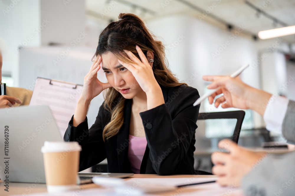 Asian businesswoman holding head getting stress or exhausted over workplace dispute at office table