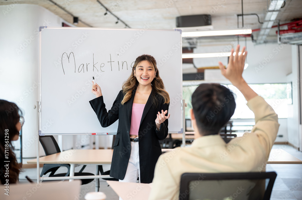 Man raising hand asking question to businesswoman after explaining marketing plan on board in office