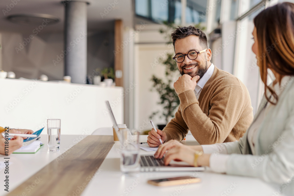 Business Professionals Collaborating at Modern Office Meeting Table with Laptops and Natural Light