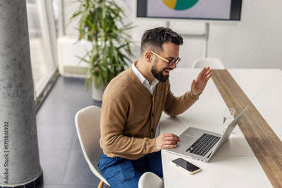 Smiling Businessman in a Tan Cardigan During a Video Call in a Bright Modern Office