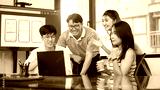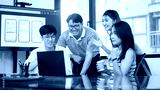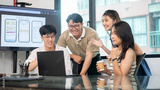 Asian man and coworkers smiling while looking at laptop on glass top table in office's meeting room.
