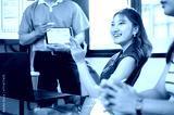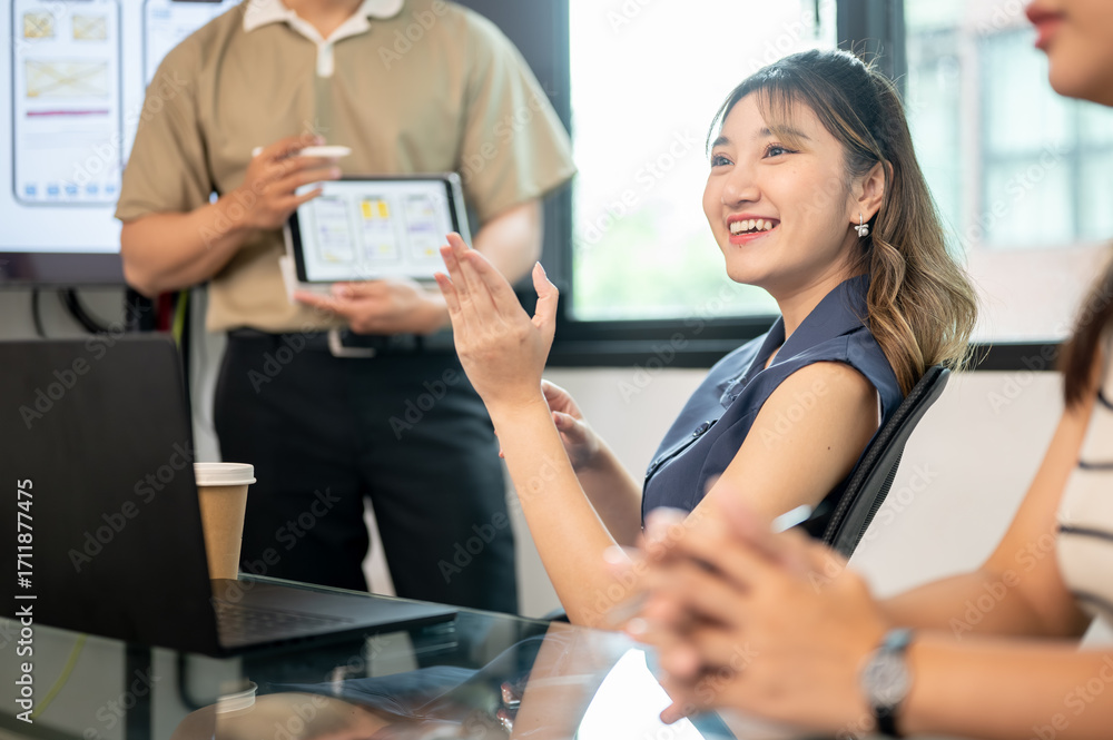 Asian woman smiling at coworker while sitting with laptop during a presentation or meeting in office