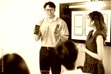 Asian man holding phone talking or presenting app to coworker in front of monitor at office meeting.