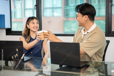 Asian man and woman office workers clinking coffee cup in front of laptop on glass top meeting table