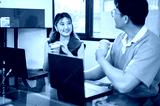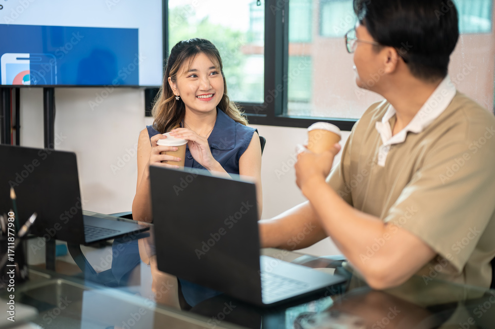 Asian man and woman office workers holding coffee cup in front of laptop on glass top meeting table.