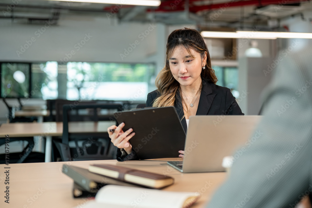 Businesswoman holding clipboard sitting with laptop across coworker at wooden table in meeting room