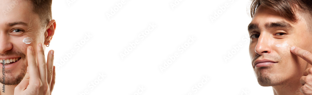 Collage. Two handsome men applying cream on their faces, symbolizing confidence and skincare against white studio background. Concept of beauty, self care, dermatology, spa procedures. Copy space.