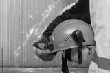 Worker holding orange safety helmet with protective earmuffs for construction and industry. Industrial safety, construction equipment, and protective workwear against noise and hazards.