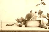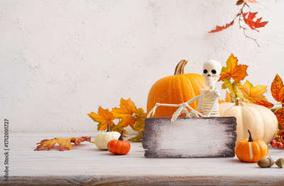 Halloween party invitation space for text with pumpkins, skeleton and autumn leaves on wooden table and abstract wall background