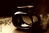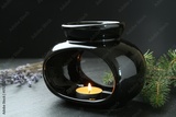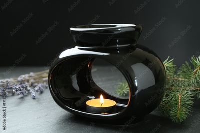 Aroma lamp with burning candle and fir tree branches on dark textured table against black background, closeup