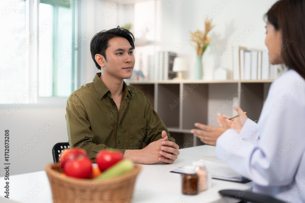 Nutrition Consultation. Male patient discussing health with a dietitian in a modern clinic.