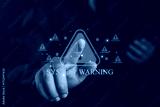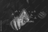 Person pointing at red system warning icon with unlocked padlock symbols, concept of cybersecurity threat, hacking risk, malware attack, data breach, online vulnerability, and information protection.