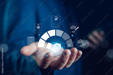 Businessman hand holding digital handshake icon with documents, concept of online agreement, smart contract, e-signature, business partnership, workflow automation, and secure digital transaction.