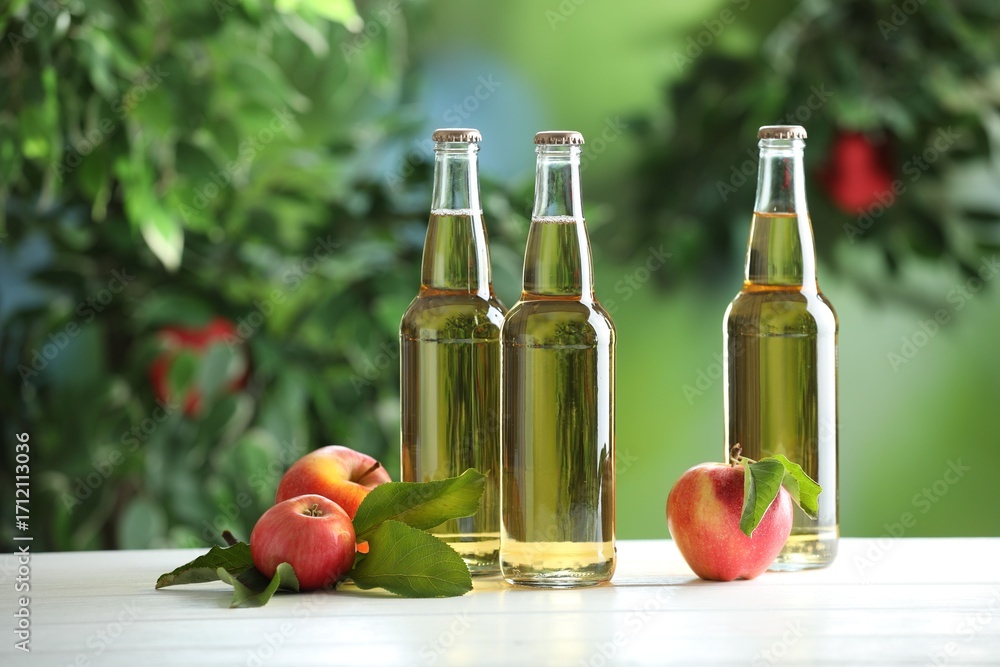 Delicious cider in glass bottles and apples on white wooden table outdoors