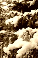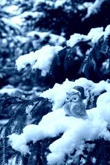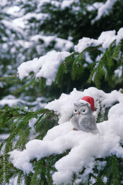 cute bird figurine in santa hat on snowy fir tree, nature forest background. festive winter season, Christmas and New year holidays concept. magic fairy tale atmosphere. cold frozen weather