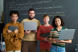 Group of multiethnic teenagers and Caucasian young adult man holding laptops standing in front of chalkboard with programming code, all looking at camera and smiling