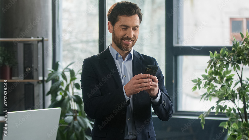 Caucasian man looking camera phone successful mature businessman entrepreneur leader employer professional manager indoors male business portrait financial boss broker finance expert agent lawyer