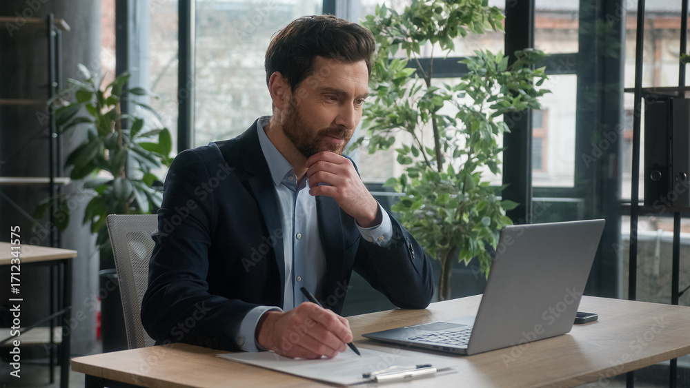 Pensive puzzled Caucasian business man businessman male entrepreneur corporate employee sales manager working in office typing on laptop searching information on Internet writing notes analyzing data