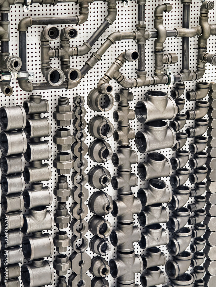 Industrial display of various metal pipe fittings and connectors on a perforated wall in a workshop