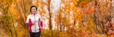 Autumn running middle age Asian woman jogging in park banner panorama. Active lifestyle mature lady in her 50s living a healthy life.