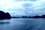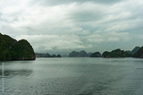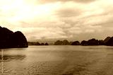 Panoramic view on scenic karst islands of Halong Bay on mist