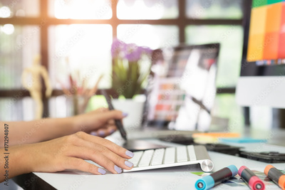 graphic design desk hand using mouse pan sketch device on creative desk.