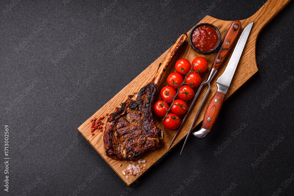 Grilled bone-in meat, beef tomahawk steak, juicy barbecued meat. Tomahawk steak