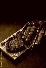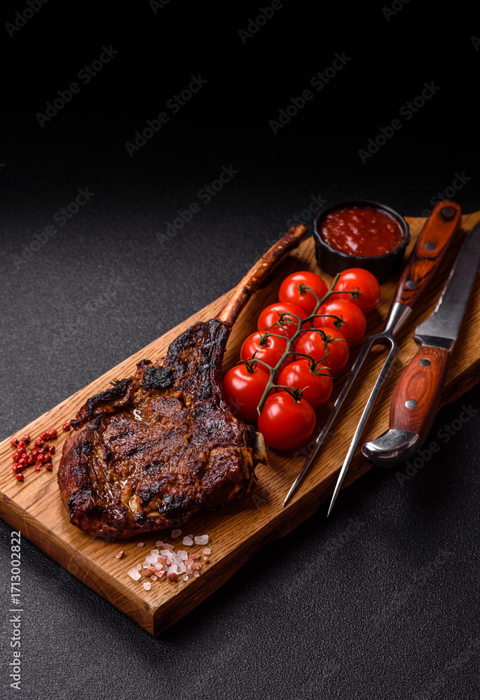 Grilled bone-in meat, beef tomahawk steak, juicy barbecued meat. Tomahawk steak