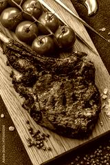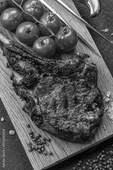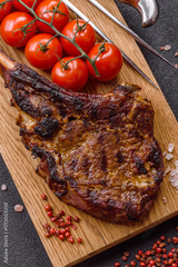 Grilled bone-in meat, beef tomahawk steak, juicy barbecued meat. Tomahawk steak