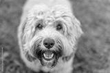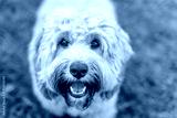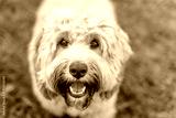 Portrait of cute Brown curly shaggy dog goldendoodle on the grass in summer