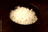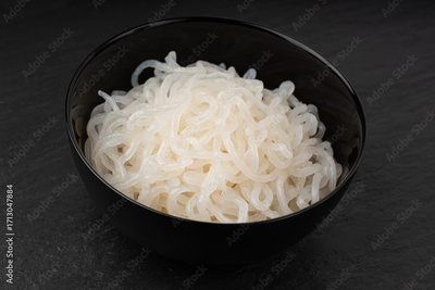Shirataki or konnyaku pasta in black bowl. Konjak jelly noodles, Japanese zero calorie sirataki